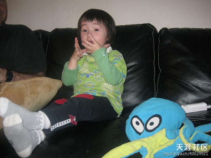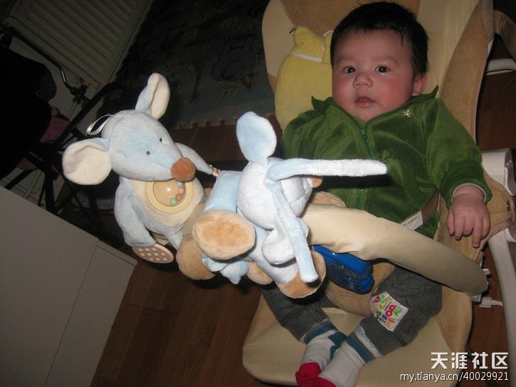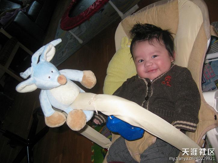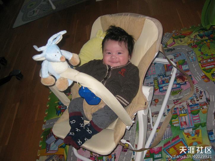 刚刚前几天,丁丁一逗就笑。这两天,他还反过来会逗人笑了。有时候他躺在小躺椅上,我在旁边看电脑,听见他嗯嗯的叫。看过去,他也正盯着我呢。看见我看过去,叫得更起劲,一边叫一边笑,哦嗷噢嗷的,好可爱啊!