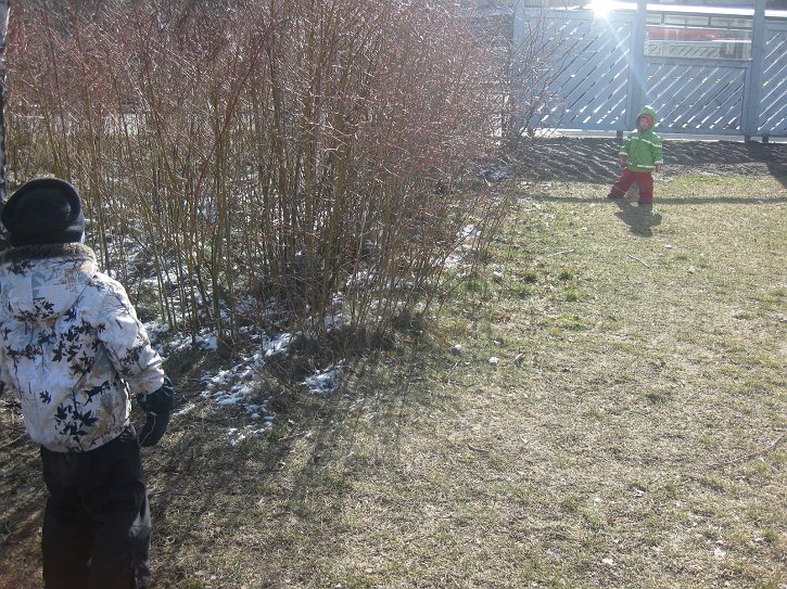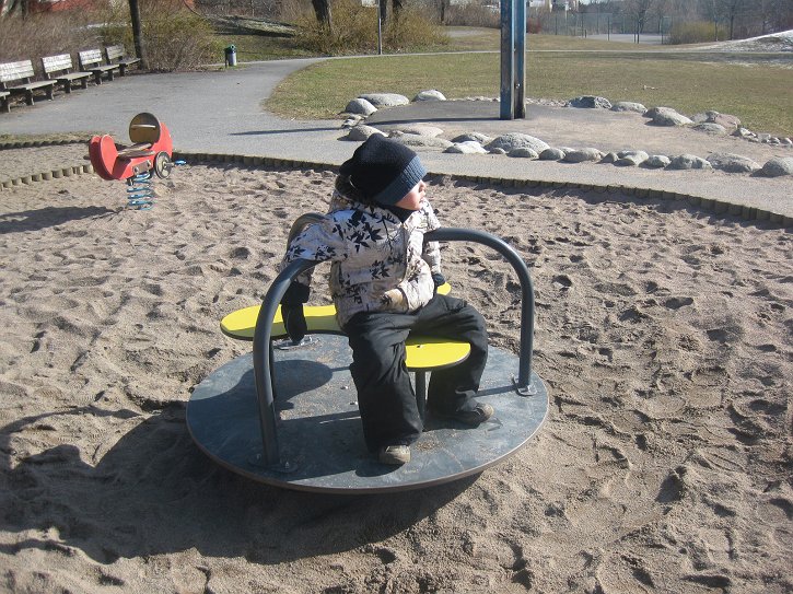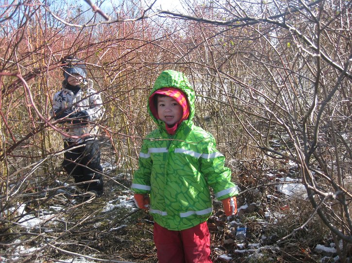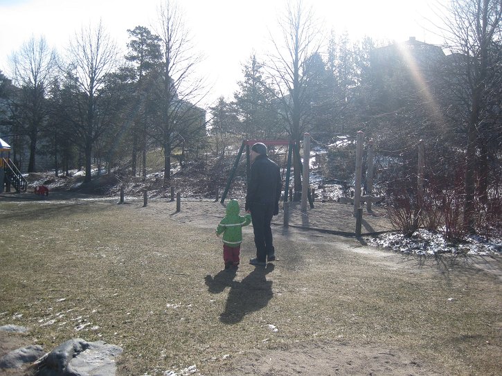 昨天天气很好,阳光明媚。严冬的积雪早就化光了,但是前天下了一天的雪,地上又留下稀稀落落的积雪了。一家 人出去小区的中心小公园逛了一下。温度在0度左右,但是看到这么明亮的阳光,我产生了一种温暖的错觉,结果给麦芽穿的衣服有点少了。眼看着她流鼻涕,却又 不愿意回家,我们就玩起了一种追逐的游戏。复活节期间,不少人去度假了,加上我们出来得比较早,小公园就只是我们一家人嘻嘻哈哈地在草地上奔跑,倒也其乐 融融……