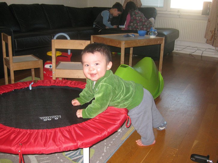 只有一次,丁丁成功地爬上了这个巨大的障碍物。但是这次,他努力了好多次,还是爬不上去。不过他的好心情也没受影响,照样美滋滋地笑着。