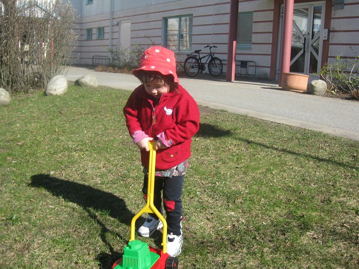 给麦芽买了一个玩具剪草机。在家里她就哗啦啦地开动起来到处跑,也不管丁丁在睡觉。我赶紧叫Sven带上她到院子里去“剪草”。