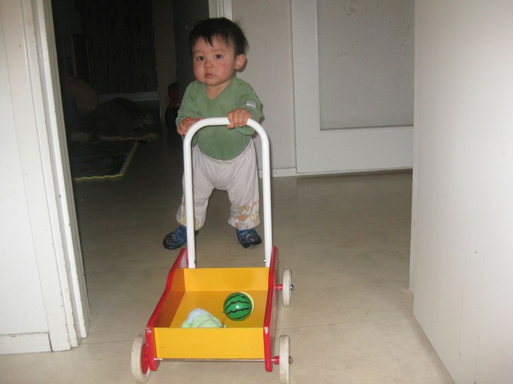 从爷爷奶奶家回来,Sven就从储物间里找出以前当当麦芽用过的学步小推车,把轮子整好了,给丁丁用。丁丁学得很快,推着小车一步一滑了一小会儿之后,现在已经能撅着小屁股推着小车走上一段了。
